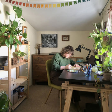 I work from my cosy home studio in Norwich England, surrounded by plants, art and trinkets.
