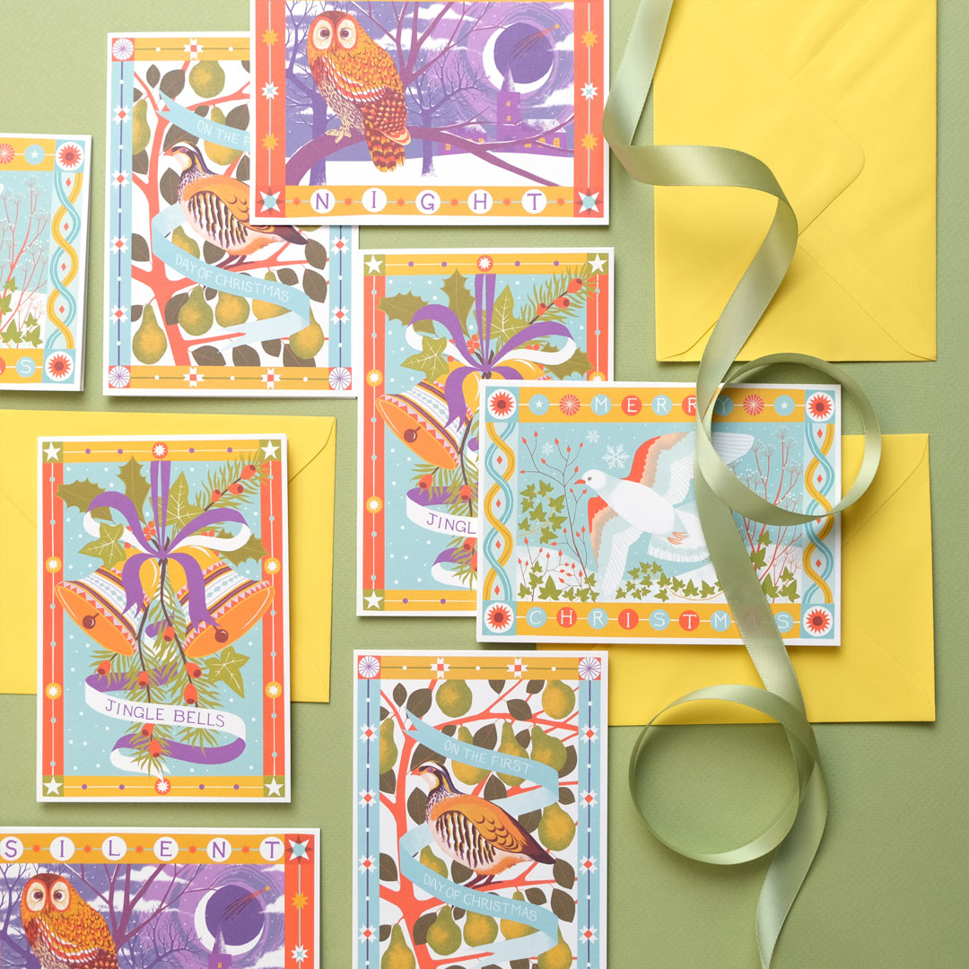8 x A6 (105mm x 148mm folded), offset litho printed on 300gsm FSC certified card stock, with yellow envelopes. Blank inside for your own message, Designed by ©Vicki Johnson, Published by Printer Johnson, Made in England