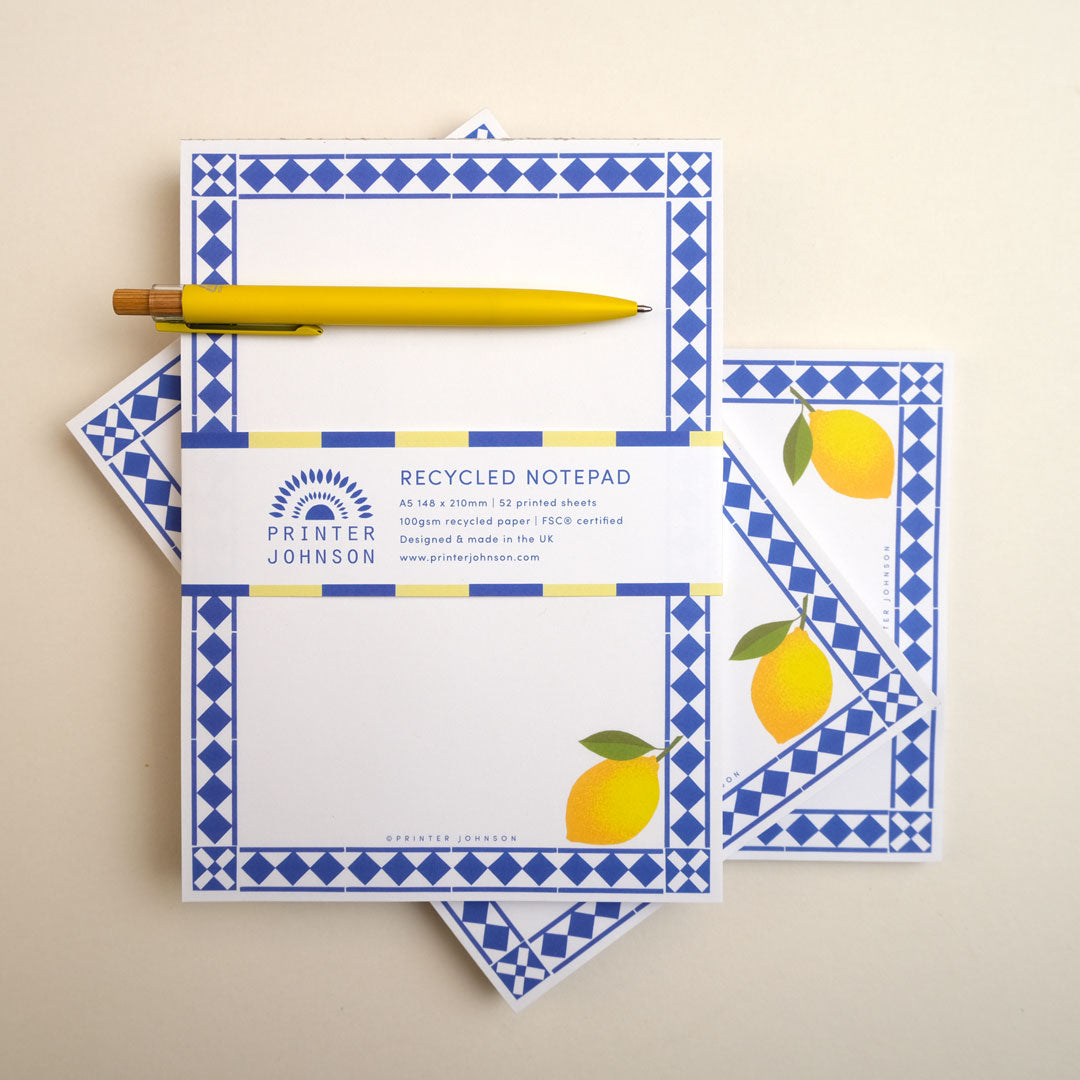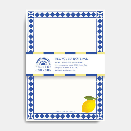 Functional and stylish, this Mediterranean themed pad design features a vibrant lemon motif with a decorative border inspired by Portuguese tiles.