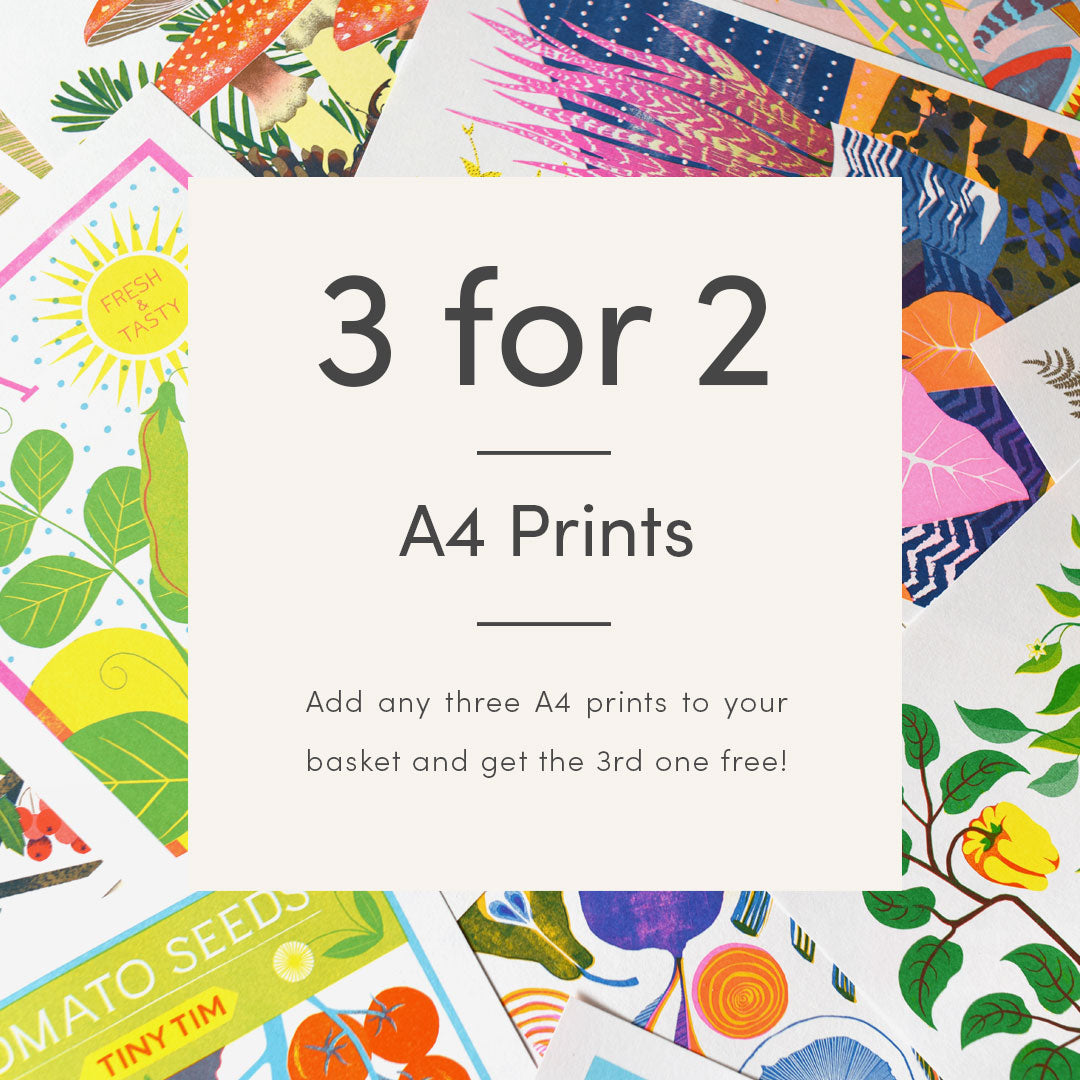A4 (210mm x 297mm), Risograph print, printed on uncoated FSC certified paper stock using eco-friendly soy-based inks, Supplied bio-cello wrapped and Greyboard backed with a print process information slip. A Risograph printer looks like a photocopier but uses a stencil to print one colour layer at a time. The paper is passed through the machine multiple times to create multi-coloured images. Registration between colour layers and coverage will vary between prints and batches, these slight imperfections are all part of this wonderful printing process and make each print unique. Designed by ©Vicki Johnson, Published by Printer Johnson, Made in England